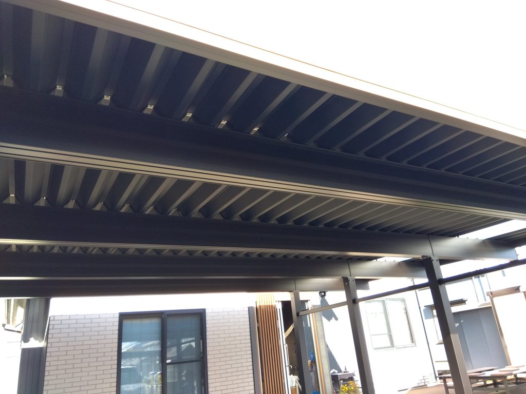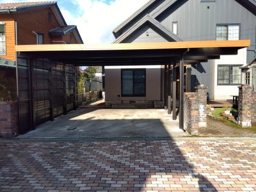 また、鼻隠しを木調色・屋根材を両面ブラック色に変更したことで無機質なカーポートがおしゃれに仕上がりました(^^♪